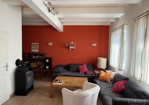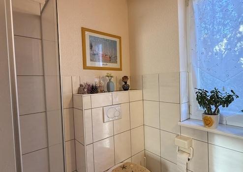 Im Erdgeschoss befindet sich weiterhin eine Garderobe, ein Gästebad mit Dusche, Waschbecken und WC sowie ein Kaminofen in der gemütlichen Wohnecke.