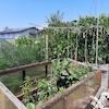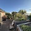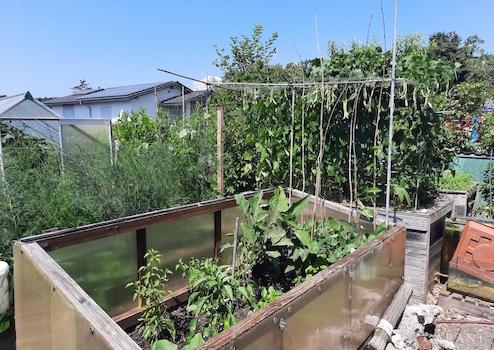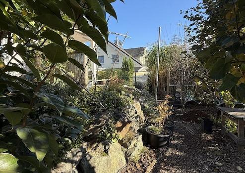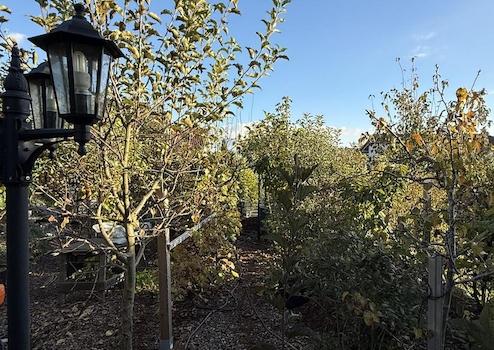 - Garten mit Obstbäumen, verschiedenen Pflanzen und Hochbeeten