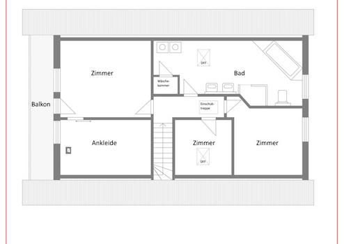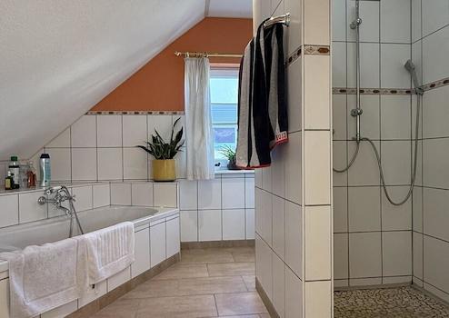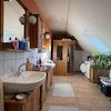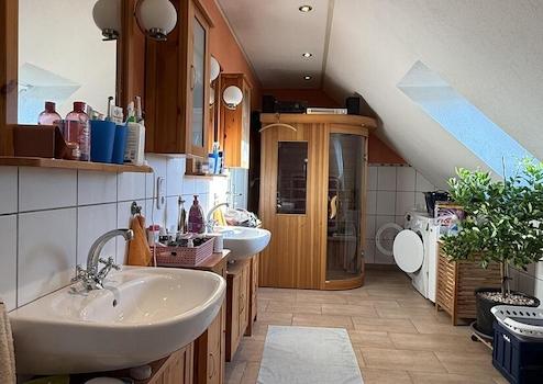 Im Dachgeschoss wurde ein zweites, größeres Tageslicht-Wohlfühlbad mit Infrarotkabine, Dusche, Badewanne, zwei Waschbecken und WC gebaut.