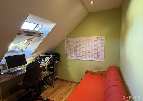 Ein Schlafzimmer mit Balkonzugang, ein zusätzliches Zimmer, das als Gäste- oder Kinderzimmer genutzt kann, sowie ein Büro sind ebenso auf der oberen Etage vorzufinden.