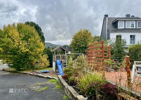 Der liebevoll gestaltete Garten mit Klettergerüst und Holzterrasse lädt zum Spielen, Entspannen und Verweilen ein und bietet reichlich Platz für vielfältige Aktivitäten im Freien.