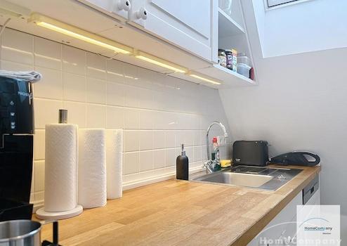 Modern möbliertes 1-Zimmer-Apartment mit Terrasse in Schwabing. EG. Der ansprechend und stilvoll möblierte Wohn-/Schlafbereich verfügt über eine Schlafcouch, Esstisch für bis zu 3 Personen und einen Kleiderschrank. Von ...