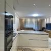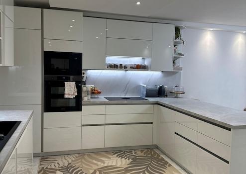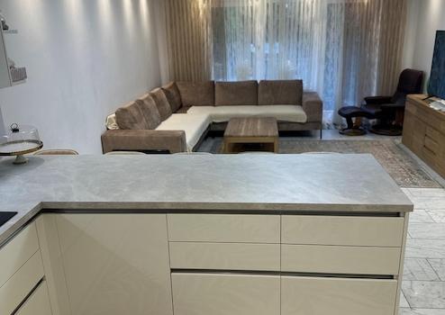 • Offene Küche im Wohnzimmer mit hochwertiger Einbauküche von Segmüller (Anschaffung 11/2022, ca. 20.000 €). Grifflose Küche mit u. a. Apothekerschrank, Le Mans Auszug, Bora-Herd, Samsung Kühl-Gefrierkombi, großer Waschtrockner usw.