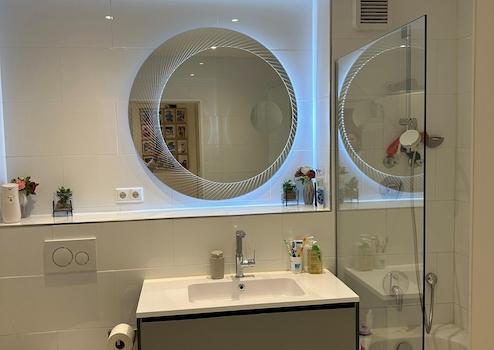 • LED-Deckenbeleuchtung und Spots in Flur, Bad und Wohnräumen, flexibel einschaltbar und dimmbar.