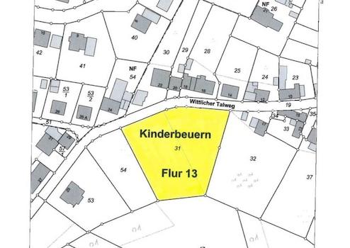 Zum Verkauf steht ein ca. 2771 m² großes Baugrundstück am Rande der Gemeinde Kinderbeuern. Das Grundstück ist mit kleineren Sträuchern bewachsen, Überreste alter Bauten sind nicht vorhanden. Rund um das Bauland befinden sich Einfamilienhäuser. Die ruhige Umgebung um das Grundstück ist durch viel Grün gekennzeichnet.