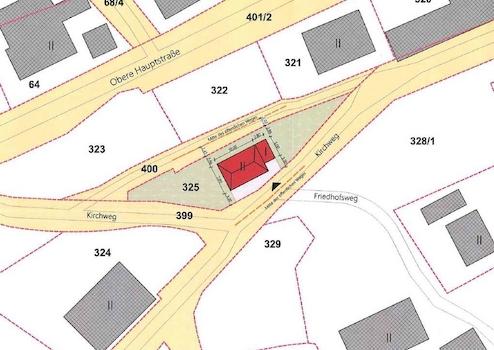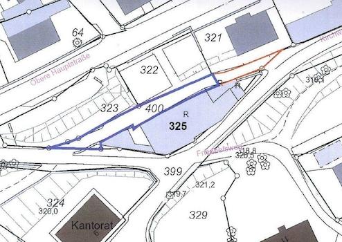 Das Kaufangebot besteht aus dem Flurstück 325 (ca. 500 m²) sowie der Teilfläche des Flurstückes 400 (ca. 214 m²).