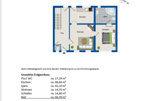 Erdgeschoss a 4 Betten: Flur/ WC, Kochen, Speis, Wohnen, Schlafen, Bad = ca. 62,28 m²
