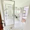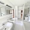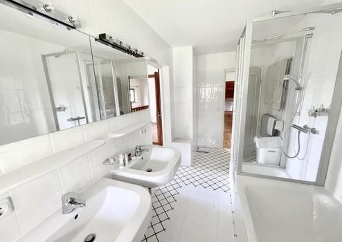 - Modernisiertes Badezimmer mit zwei Waschbecken, Dusche und separater Badewanne.