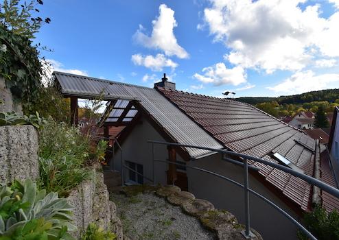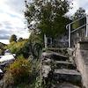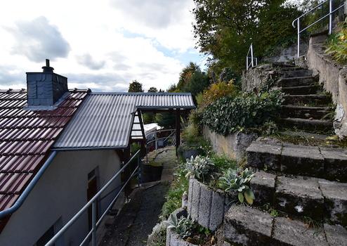 terrassenartig, hangig, über Steinstufen mit Stahlgeländer erreichbar, Pflanzsteine, kleiner Freisitz mit Aussicht