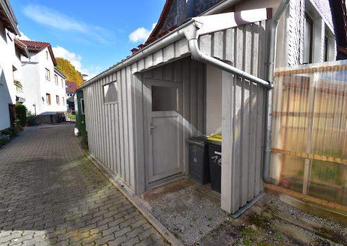 Die überdachte Abstellfläche in Holzbauweise mit ca. 7 m² auf dem gegenüberliegenden Grundstück ist derzeit von der Stadt Suhl gepachtet.