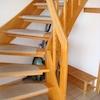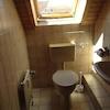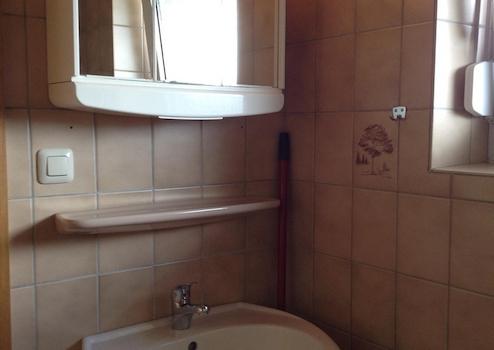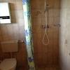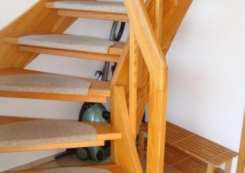 Jede Doppelhaushälfte hat einen eigenen Zugang im Erdgeschoß. Vom Eingangsflur gehen Duschbad mit WC und Wohn-/Eßzimmer mit Küchenzeile ab. Eine Holztreppe führte ins Oberschoß. Vom kleinen Flur geht es in zwei Schlafzimmer und ins Gäste-WC mit Waschbecken.