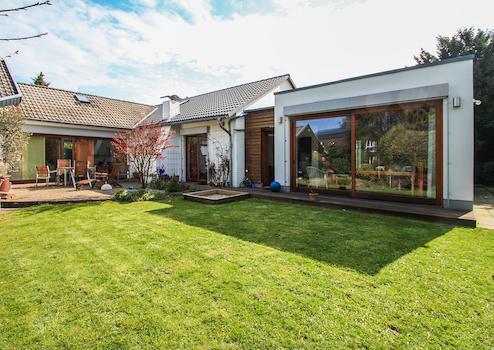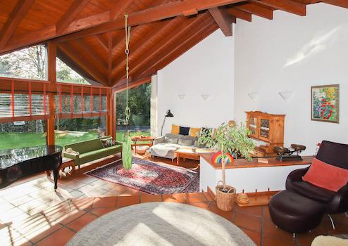 Dieses großzügige Einfamilienhaus mit Einlieger vereint die Vorteile von Wohnen und Arbeiten in einem Gebäude. Das eingeschossige Landhaus wurde 1963 in zeitloser Architektur erbaut, 1991 um die Wohnhalle erweitert und 2006 mit dem separaten Bürotrakt vollendet.