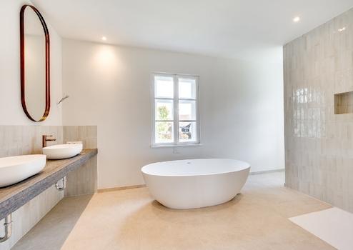 - Tageslichtbadezimmer mit freistehener Wanne und bodengleicher Dusche