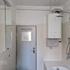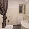 Das Badezimmer ist modern gefliest und mit einer Badewanne ausgestattet, die zum Entspannen einlädt. Ein großer Spiegel und ein Waschbecken mit Unterschrank bieten zusätzlichen Komfort.
