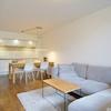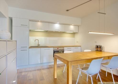 Die schicke offene Einbauküche enthält eine Spülmaschine, Kochfeld und Backofen, Mikrowelle, Koch- und Essgeschirr, es gibt einen schönen großen Holztisch mit 4 Stühlen. Im Wohnbereich steht eine große Couchlandschaft und ein großes Smart-TV-Gerät (AppleTV), von hier aus blickt man über einen überdachten Balkon ins Grüne.