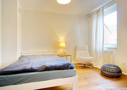 Die beiden Schlafzimmer sind jeweils mit einem Bett (1,40 x 2,00 Meter) ausgestattet, in einem der Zimmer steht ein großer Schreibtisch bereit. Auf Anfrage kann der Vermieter ein Bett in der Größe 1,60 x 2,00 m zur Verfügung stellen. Es gibt in einem Schlafzimmer einen Kleiderschrank und im Flur zwei große Einbauschränke und eine große Kommode.