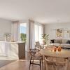 Die Wohneinheit verfügt über zwei Räume, ein Masterbad mit bodengleicher Dusche und Badewanne sowie einen Abstellraum. Das über 26 m² große, lichtdurchflutete Wohnzimmer ist der Mittelpunkt der Wohnung und führt direkt auf den Balkon. Die offene Küche wurde geschickt als Nische im Wohnbereich integriert, sodass die Bereiche Wohnen, Essen und Kochen harmonisch ineinander übergehen, jedoch dennoch voneinander abgegrenzt bleiben.