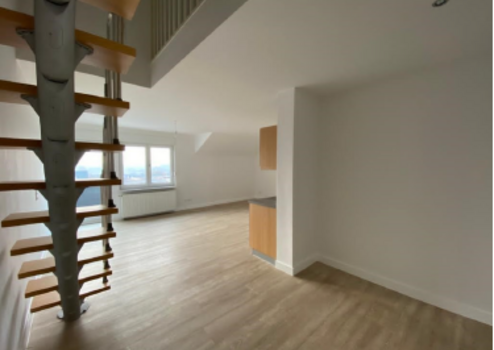 Im 1. Obergeschoss befinden sich ein offener Wohn- und Essbereich mit einer integrierten Einbauküche und Zugang zum Balkon, ein Schlafzimmer und ein hell gefliestes Bad. Der Dachspitz, der als Abstellraum genehmigt wurde, bietet ein weiteres Zimmer. Die Wohnung ist mit robustem PVC-Boden ausgestattet. Auch eine Einbauküche ist bereits vor Ort.