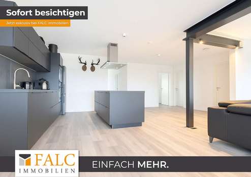 Bereits beim Betreten der Wohnung öffnet sich der Blick in den großzügigen Wohn- und Essbereich, der das Herzstück des Objekts bildet. Vom Eingangsbereich gelangt man direkt in den offenen Wohnraum, wo sich links die moderne Einbauküche der Marke Nolte mit hochwertigen Elektrogeräten befindet. Der weitläufige, offene Grundriss sorgt für ein luftiges Raumgefühl und verbindet Kochen, Essen und Wohnen auf harmonische Weise.
