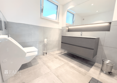 Elektrische Rollläden an allen Fenstern ermöglichen eine bequeme und flexible Steuerung von Licht, Sichtschutz und Privatsphäre. Ergänzt wird dies durch eine zeitgemäße LED-Beleuchtung, die in Kombination mit der modernen Haustechnik für eine stimmungsvolle Atmosphäre sorgt.