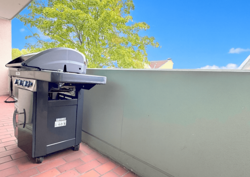 Große Fensterfronten lassen viel Tageslicht herein und führen auf den ersten Balkon, der vom Wohnbereich aus begehbar ist und zum Entspannen im Freien einlädt. Hier lassen sich sonnige Stunden und laue Sommerabende in angenehmer Atmosphäre genießen.