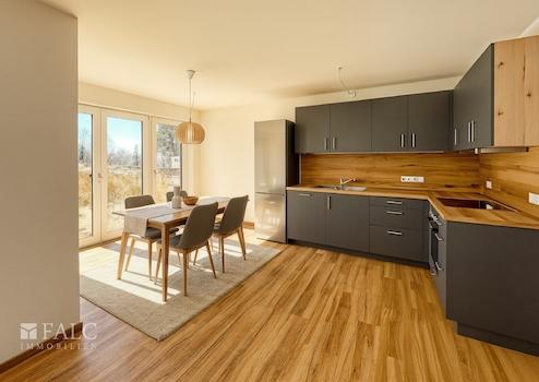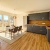 Hier öffnet sich der großzügige Wohn-, Ess- und Kochbereich mit fließenden Übergängen und direktem Zugang zur sonnigen Terrasse – perfekt für entspannte Stunden im Freien und stilvolle Abende mit Freunden.