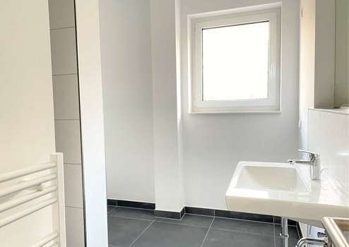 Mit viel Platz neben Dusche und Badewanne ist das Tageslichtbad eine absolute Wohlfühloase. Dunkle Bodenfliesen werden mit hellen Bodenfliesen für einen modernen Look kombiniert. In dieser Wohnung verbindet sich Moderne mit idyllischer Natur.