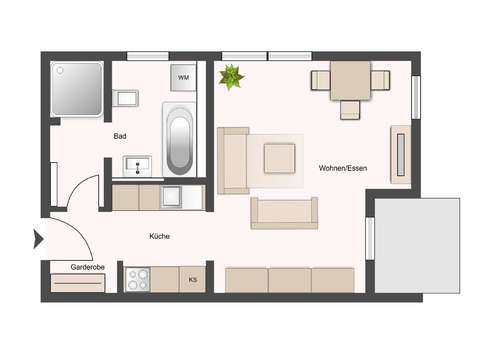Beim Betreten dieser schönen Erdgeschosswohnung fällt sofort der offene, lichtdurchflutete Grundriss der Wohnung auf. Gerade zu kommen Sie über die praktisch eingebaute Küche in den offenen Wohn- und Essbereich mit Zugang zur Terrasse. Eine schöne Südterrasse lädt zum Entspannen in der warmen Sonne ein.