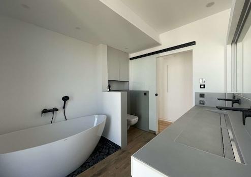 - 2 Bäder mit insgesamt zwei Duschen (einmal mit Infrarotheizmodul) + einer freistehenden Badewanne