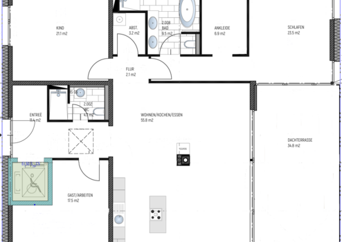 Neben dem großen, offenen Wohn- und Essbereich gibt es 3 weitere Zimmer, sowie eine Ankleide und eine große Dachterrasse. Der Außenbereich mit großem, beheizbaren Pool und einer Terrasse mit Südausrichtung rundet das Angebot ab.