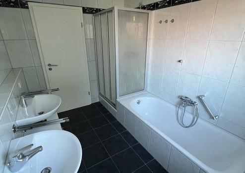 - Badezimmer mit Badewanne, Dusche, WC und Doppelwaschbecken