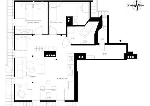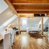 Schon beim Eintreten spürt man die besondere Stimmung: Licht durchflutet die Räume, die großzügigen Fenster schenken weite Ausblicke über die Dächer der Stadt – eine Aussicht, die jeden Tag aufs Neue inspiriert. Das Herzstück bildet der offene Wohnbereich: sichtbare Balken verleihen ihm Wärme und Charakter, während er zugleich den perfekten Rahmen für gesellige Abende oder entspannte Stunden bietet. Angeschlossen daran liegt die moderne Einbauküche mit gemütlichem Essbereich – ein Ort, an dem man gerne zusammenkommt.