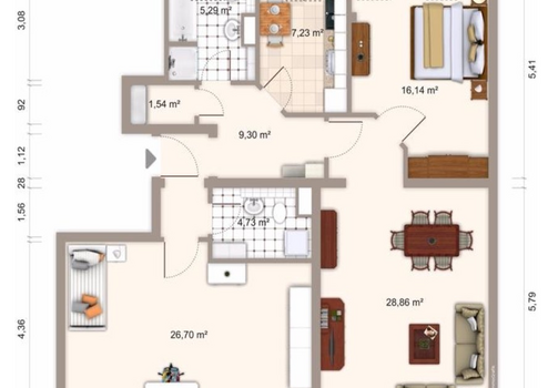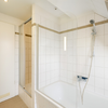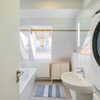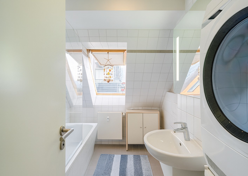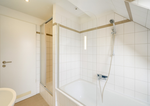 Das Hauptbad verfügt über eine Badewanne, eine separate Dusche sowie einen Anschluss für Waschmaschine / Trockner. Das zweite Bad bietet die Möglichkeit, eine zusätzliche Dusche zu installieren, was in dieser Wohnungsgröße eine seltene Besonderheit darstellt.