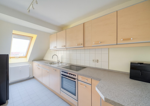Die voll ausgestattete Küche enthält Herd, Backofen, Geschirrspüler und Kühlschrank. Ein eigenes Kellerabteil bietet zusätzlichen Stauraum.
