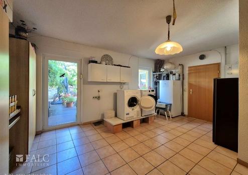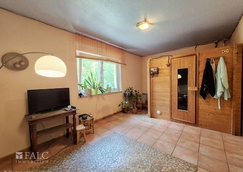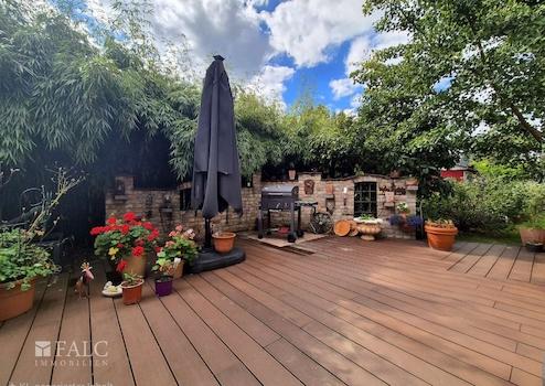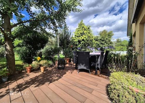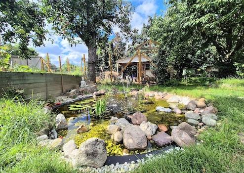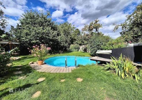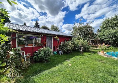 Ein besonderes Highlight ist der Zugang zur Terrasse, der einen wunderbaren Blick in den großen Garten bietet. Der Garten selbst ist ein Paradies für Naturliebhaber und lädt mit seinem Pool und einem kleinen Teich zum Entspannen ein. Ein Gartenhaus bietet zusätzlichen Stauraum oder kann als Hobbyraum genutzt werden.