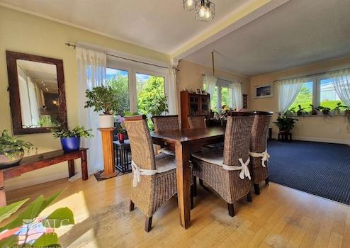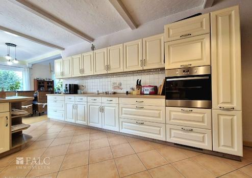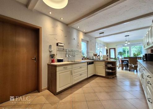 Das Wohnzimmer bildet das Herzstück des Hauses und überzeugt durch großzügige Fensterflächen, die für reichlich Tageslicht sorgen. Von hier aus gelangen Sie direkt in den offen gestalteten Essbereich, der nahtlos in die moderne Küche übergeht und eine einladende Atmosphäre für gemeinsame Mahlzeiten schafft. Die Küche ist hochwertig ausgestattet und bietet viel Raum für kulinarische Kreativität.