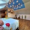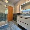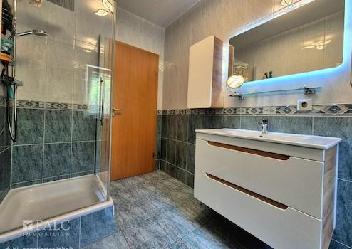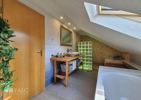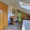 Im Obergeschoss befindet sich ein Schlafzimmer, das durch die Größe und Helligkeit überzeugt. Das Hauptbadezimmer ist mit einer modernen Dusche und einer Badewanne ausgestattet und bietet durch seine Dachfenster viel natürliches Licht. Ein zusätzliches Gäste-WC mit Dusche im Erdgeschoss sorgt für Komfort und Flexibilität.
