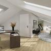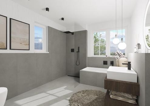 Die Grundrisse im Obergeschoss unterscheiden sich in der Lage des Balkons und der Anzahl der Badezimmer. Edle Echtholz-Parkettböden verleihen dem gesamten Haus eine warme und einladende Atmosphäre. Das Haus bietet zwei bis drei elegant gestaltete Badezimmer, die mit hochwertigen Sanitäreinrichtungen von Villeroy & Boch ausgestattet sind und verbinden Komfort und Eleganz.