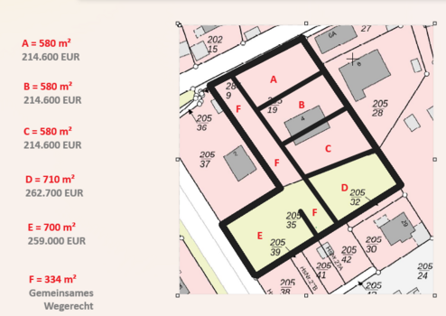 Der Bebauungsplan wird auf Anfrage zur Verfügung gestellt. Wir machen darauf aufmerksam, dass die Einmessung noch nicht erfolgt ist, um den Erwerbern bestmöglichen Handlungsspielraum zu ermöglichen. Auf der Fläche B in der Übersicht befindet sich aktuell noch eine Bestandsimmobilie. Die Wohnfläche beträgt ca. 217 m², Baujahr 1969, und gliedert sich in zwei Wohneinheiten auf. Im Untergeschoss des Hauses befindet sich eine Doppelgarage.