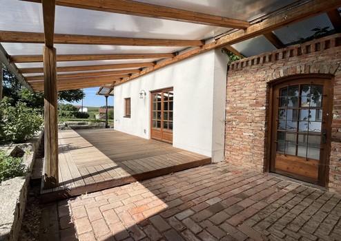 Auf der Westseite finden Sie eine überdachte große Terrasse. Steinerne Beeteinfassungen bieten sich für eine mediterane Bepflanzung an. Hier genießen Sie die Abendsonne und können wind- und wettergeschützt ausspannen.