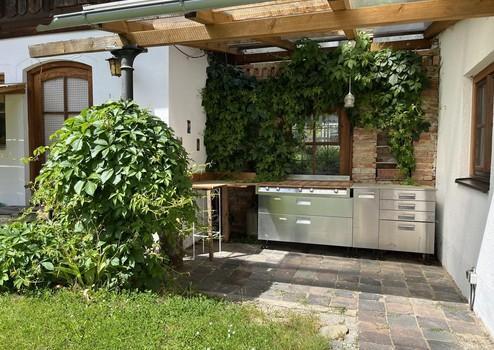 Im wunderschön eingewachsenen Innenhof können Sie unter Weinreben einen schattigen Tag genießen, sich dem Duft der Rosen hingeben oder Kräuter aus einem gemauerten Kräuterbeet ernten. Für Kinder gibt es Möglichkeiten zum Schaukeln und ein Sandkasten läd zum Spielen ein. Eine idyllische Nische mit Natursteinmauer kann für eine Außenküche genutzt werden.
