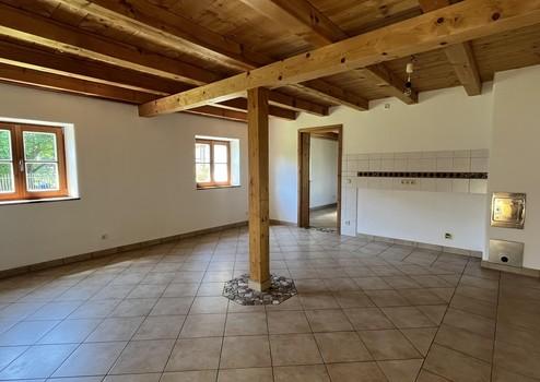 Im 2012 sanierten Ostteil wurden gut erhaltene und sehenswerte Materialien von "damals" verbaut bzw. wiederverwendet, so dass dieser Teil seinen "historischen" Charakter behalten hat. Über einen Flur mit Fliesenboden gelangen Sie in eine geräumige Küche an die sich ein offener Wohnraum anschließt. Dieser mit etwa 50qm großzügige und mit Echtholzfußboden ausgestattete Gesamtraum wird dominiert von einem eiförmigen Grundofen mit Sitzflächen, der den gesamten Raum angenehm beheizen kann.