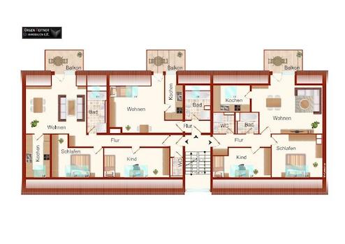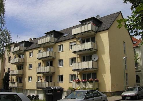 Die Aufteilung der Wohngen ist wie folgt: 3 Wohnungen bestehen aus 5 Räumen und haben eine Größe von 103,11 qm, 3 Wohnungen haben 4 Räume mit einer Gesamtgröße von von 94,63 qm , 3 Wohnungen mit 2 Räumen mit einer Fläche von von 42,74 qm. Im Dachgeschoß befinden sich drei Wohnen mit 3 und 1 Raum. Die Dreiraumwohnungen haben eine Größe von 74,70 qm und 70,39 qm, die 1-Raum-Wohnung hat eine Fläche von 35,02 qm.