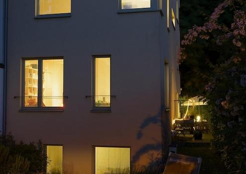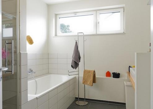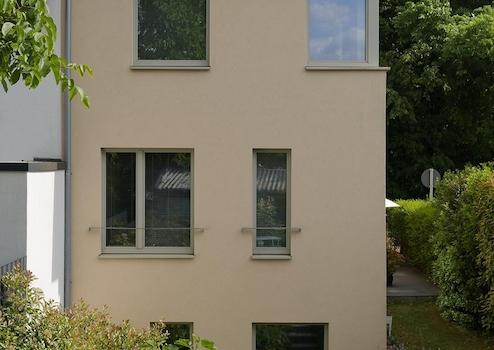 Fassade gedämmt, Dreifachverglasung, Fenster an Westseite mit sommerlichem Wärmeschutz (leicht getönt), Aquathermie mit 7,7 m² Brutto-Kollektorfläche auf dem Dach, wasserführender und zentral gesteuerter Pelletofen im Wohnzimmer, 800-l-Wärmespeicher im Keller, kontrollierte Wohnraumlüftung mit Wärmerückgewinnung, geringer CO₂-Fußabdruck durch Unabhängigkeit von fossilen Brennstoffen, in allen Wohnräumen (außer Souterrain) vorbereitete Anschlüsse für die optionale spätere Montage von Heizkörpern (in beiden Bädern bereits montiert).