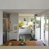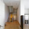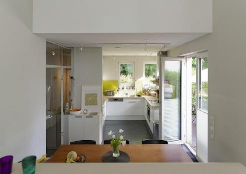 Erdgeschoss mit offener Küche und Essbereich, Gäste-WC sowie Wohnzimmer im etwa 1m höherliegenden Halbgeschoss. Die Terrasse zum Garten erreicht man sowohl über die Küche als auch vom Wohnzimmer aus über eine Außentreppe.