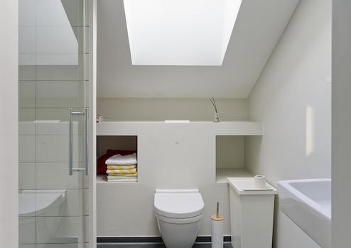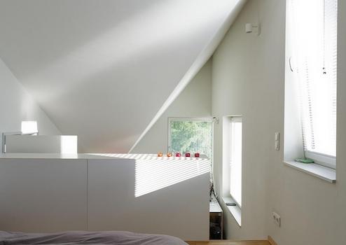 Das Dachgeschoss bietet ein auf zwei Ebenen aufgeteiltes Zimmer, das momentan als Schlaf- und Arbeitsbereich genutzt wird sowie ein weiteres, kleines Badezimmer mit WC und Dusche. Zusätzlich befindet sich hier ein über das Treppenhaus zugänglicher Speicherraum.