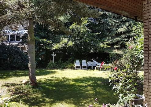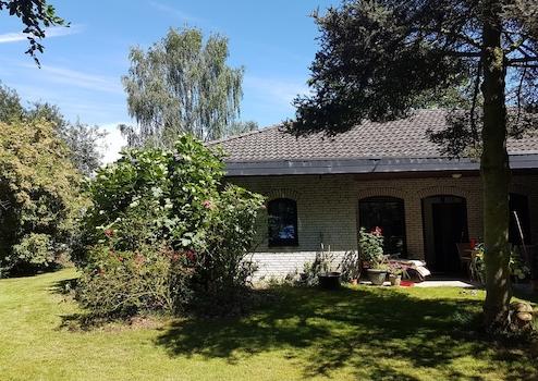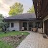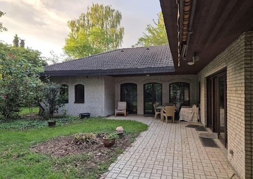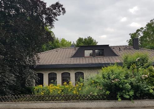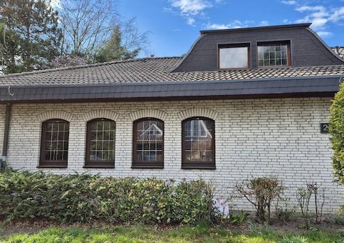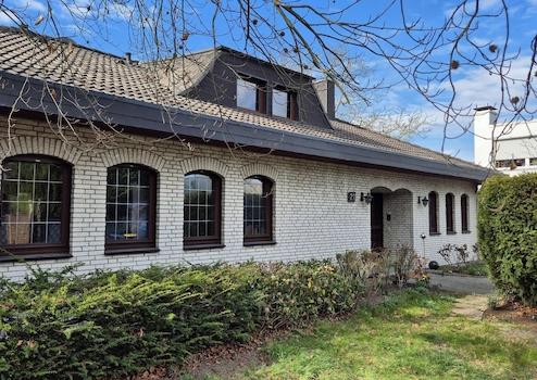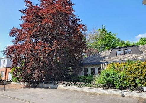 Grosszügiger freistehender Winkel - Bungalow in Korschenbroich-Kleinenbroich auf 1552 qm Grundstück mit grossem Garten und alten Baumbestand im GEWERBEGEBIET PÜLLENWEG. Geeignet für Wohnen und Arbeiten unter einem Dach. Doppelgarage