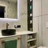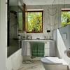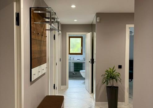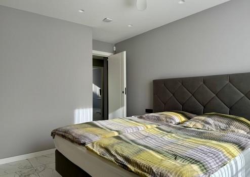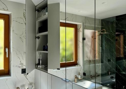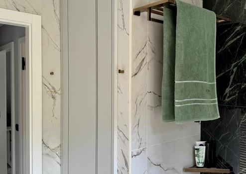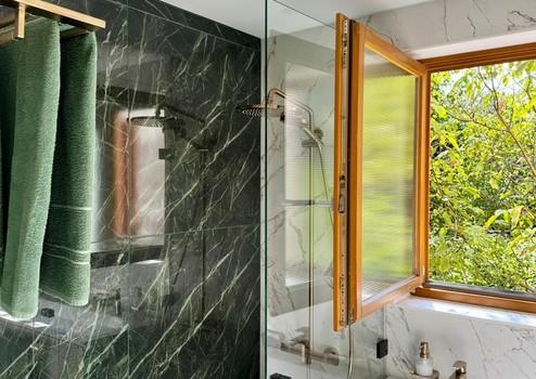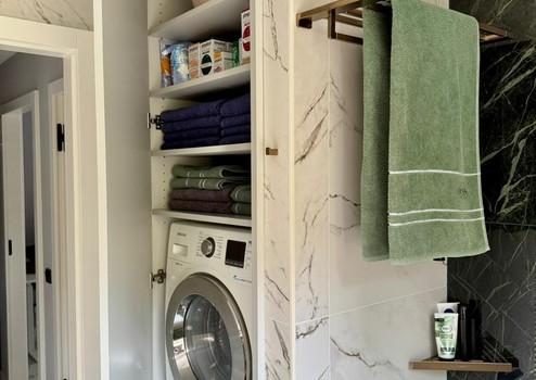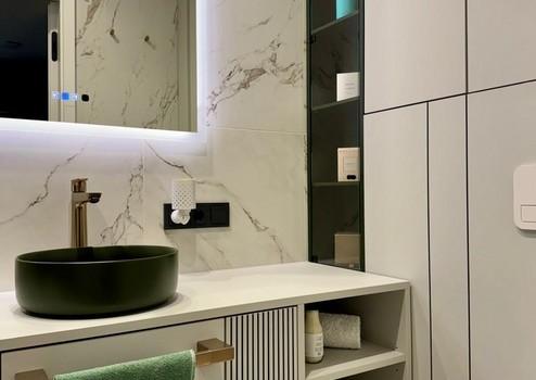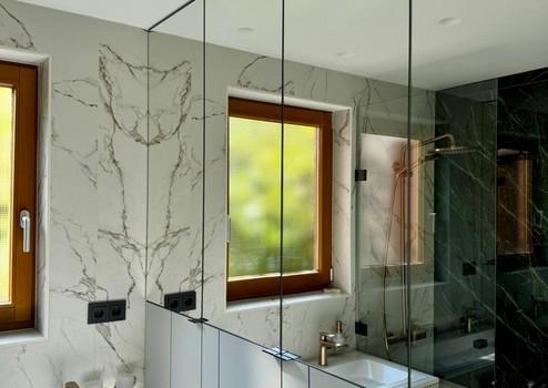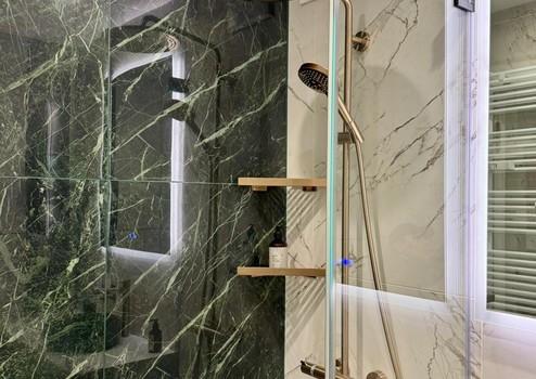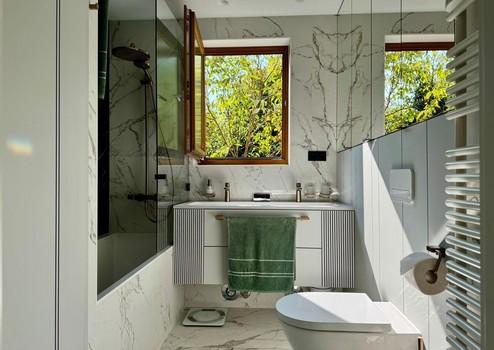 Das von einem Architekten- und Designerteam neu entwickelte Bad-Konzept vereint Luxus und Funktionalität auf höchstem Niveau. Das Masterbad bietet eine Badewanne von Villeroy & Boch, ein Doppelwaschbecken von Kaldewei und einen elegant in einem Einbauschrank integrierten Waschmaschinenanschluss. Das Gästebad überzeugt mit einer maßgefertigten Duschkabine. Hansgrohe-Armaturen in Brushed Bronze und italienische Fliesen im grünen Marmor-Design verleihen beiden Räumen eine exklusive Atmosphäre.