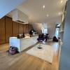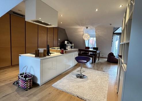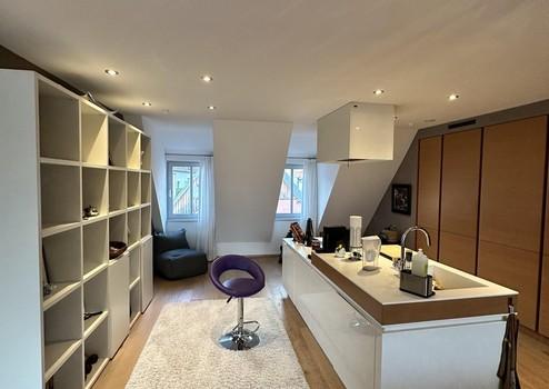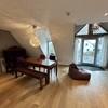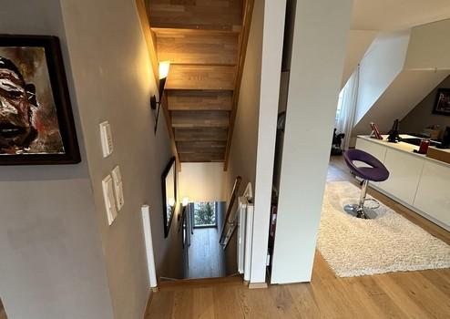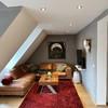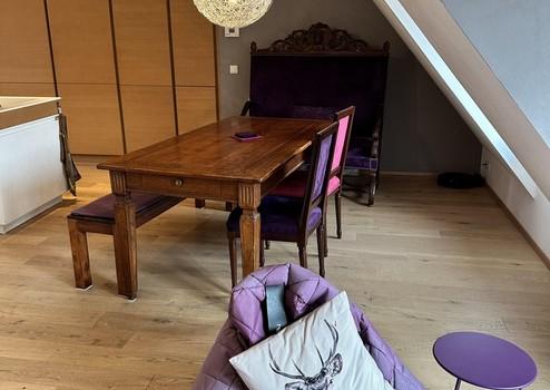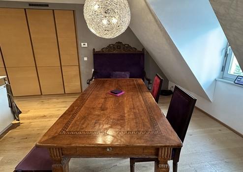 Wenn Sie durch die Eingangsgaube den offenen Wohnbereich betreten, befindet sich links das Wohnzimmer und rechts das Esszimmer mit Küche. Die hochwertige Lackküche der Marke Leicht ist mit Miele Geräten bestückt.