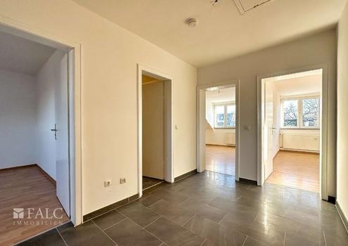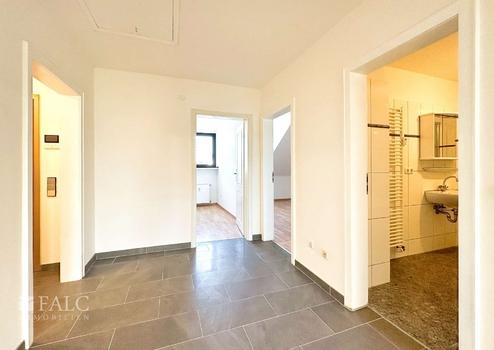 Schon beim Betreten des Gebäudes überzeugt die gepflegte Außenansicht mit heller Fassade und solider Bauweise. Über den einladenden Eingangsbereich gelangen Sie in die Wohnung, deren Diele Platz für eine praktische Garderobe bietet.